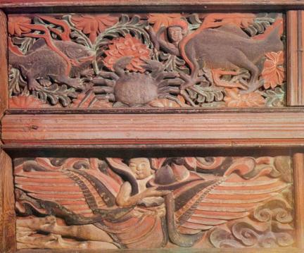 측면은 정면과 같은 규칙 없이 자유롭게 배치되었고, 보다 다양한 도상으로 구성되었다. 오른쪽에는 청학, 홍학, 기린, 적유, 저인국 등이 조각되었고 왼쪽에는 기린, 신구, 잉어, 대해, 제어, 화상어, 마갈어, 가릉빈가, 선도, 인어, 물고기 몸에 새의 다리를 하고 사람 얼굴을 한 도상 등이 조각되었다.